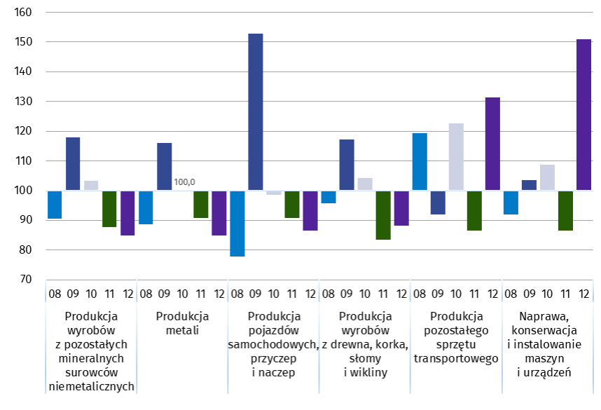 W grudniu 2025 r. spadek produkcji sprzedanej (w cenach stałych), w porównaniu z listopadem 2025 r., odnotowano w 18 (spośród 34) działach przemysłu, m.in. w produkcji wyrobów z gumy i tworzyw sztucznych oraz w produkcji metali – po 15,1%, pojazdów samochodowych, przyczep i naczep – o 13,6%, wyrobów z drewna, korka, słomy i wikliny – o 11,8%, mebli – o 8,2%, chemikaliów i wyrobów chemicznych – o 7,5%, papieru i wyrobów z papieru – o 5,9%.