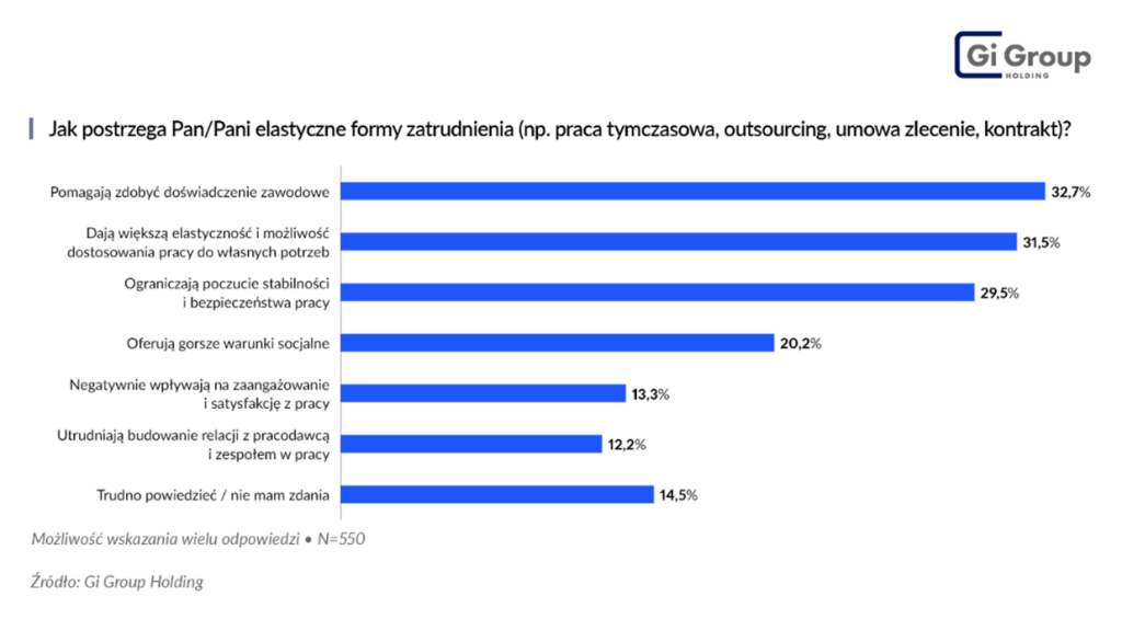 Na ograniczenie poczucia stabilności i bezpieczeństwa pracy elastycznych form zatrudnienia wskazuje 29,5% ankietowanych. Przede wszystkim w grupie wiekowej 25-44 (32%) mężczyzn oraz kobiet (33%). Część pracowników uważa też, że te formy zatrudnienia oferują gorsze warunki socjalne (20,2%). Ponad 13% twierdzi też, że zatrudnienie w oparciu o takie umowy niekorzystnie przekłada się na zaangażowanie i satysfakcję z pracy, a przeszło 12% obawia się utrudnionego budowania relacji z pracodawcą i zespołem.