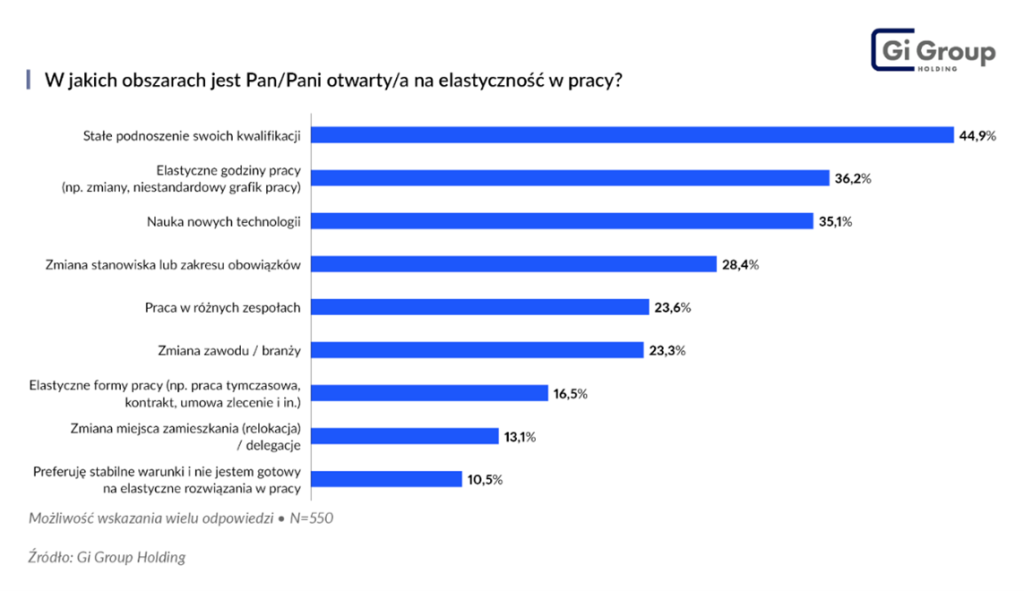 Zatrudnieni widzą elastyczność pracy przede wszystkim jako stałe podnoszenie kwalifikacji. Świadczy o tym wysoki odsetek osób deklarujących otwartość na rozwój umiejętności (blisko 45%) oraz naukę w obszarze nowych technologii (35%).