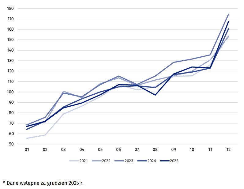 Porównując grudzień 2025 r. do poprzedniego miesiąca, produkcja budowlano-montażowa zwiększyła się w przedsiębiorstwach budujących obiekty inżynierii lądowej i wodnej (o 50,1%), w podmiotach realizujących roboty budowlane specjalistyczne (o 30,6%) oraz zajmujących się wznoszeniem budynków (o 21,1%).