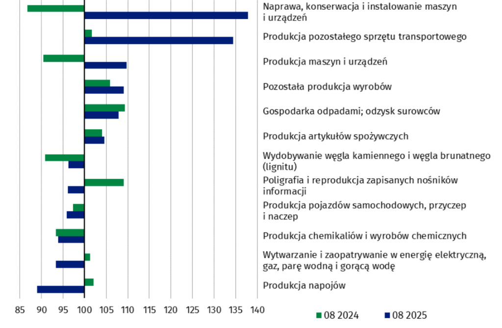 Według wstępnych danych, w sierpniu br. wzrost produkcji sprzedanej w cenach stałych odnotowano w 17 z 34 działów przemysłu. Największy wzrost zanotowano w naprawie, konserwacji i instalowaniu maszyn i urządzeń – o 37,9%. Produkcja pozostałego sprzętu transportowego wzrosła o 34,4%. Produkcja maszyn i urządzeń wzrosła o 9,7%. W gospodarce odpadami i odzysku surowców odnotowano wzrost o 7,9%. Produkcja wyrobów z drewna, korka, słomy i wikliny wzrosła o 5,6%. Artykuły spożywcze podrożały o 4,6%. Produkcja metali wzrosła o 2,8%, a wyrobów z metali o 2,7%.
