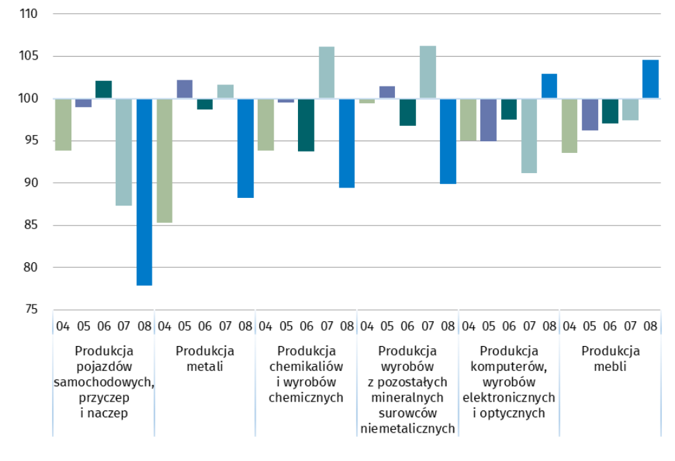 W sierpniu br. spadek produkcji sprzedanej (w cenach stałych), w porównaniu z lipcem br., odnotowano w 29 (spośród 34) działach przemysłu, m.in. w produkcji pojazdów samochodowych, przyczep i naczep – o 22,1%, metali – o 11,8%, chemikaliów i wyrobów chemicznych – o 10,6%, papieru i wyrobów z papieru oraz wyrobów z pozostałych mineralnych surowców niemetalicznych – po 10,1%, wyrobów z gumy i tworzyw sztucznych – o 9,8%, maszyn i urządzeń – o 8,6%, w naprawie, konserwacji i instalowaniu maszyn i urządzeń – o 8,3%, w produkcji urządzeń elektrycznych – o 7,7%.